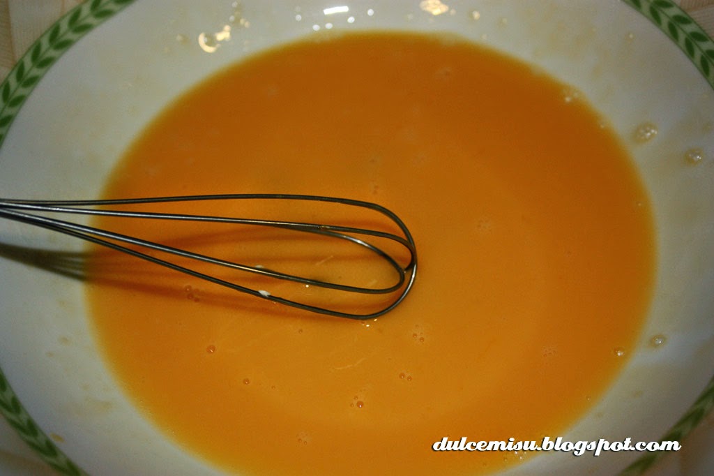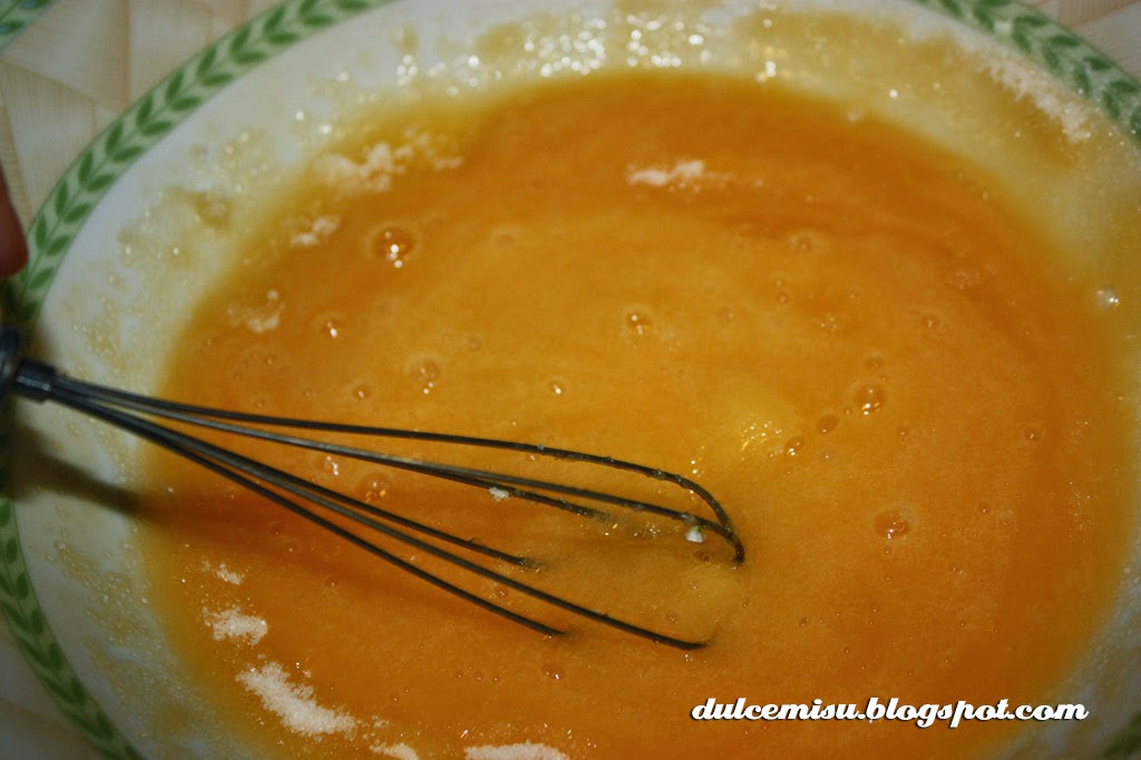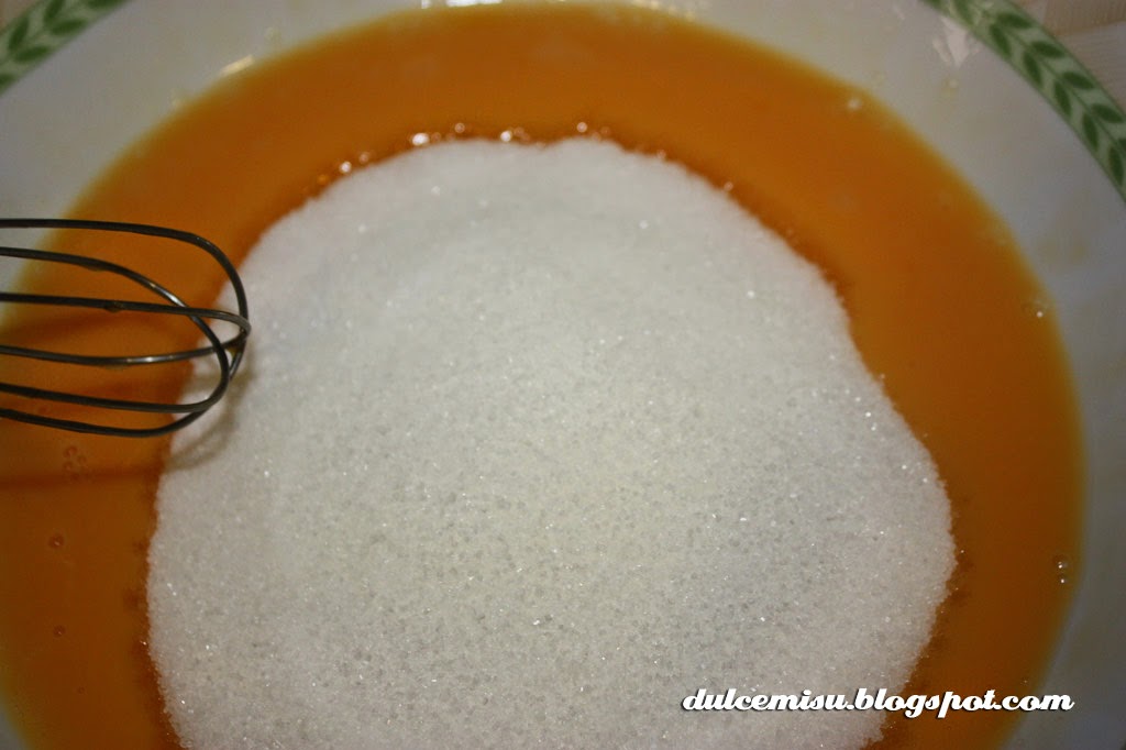 Mientras el horno se va calentando, en un bol batimos los huevos con las barillas. Añadimos el azúcar y mezclamos bien.