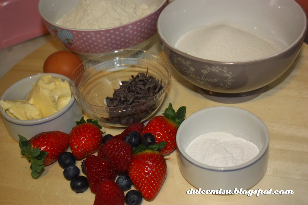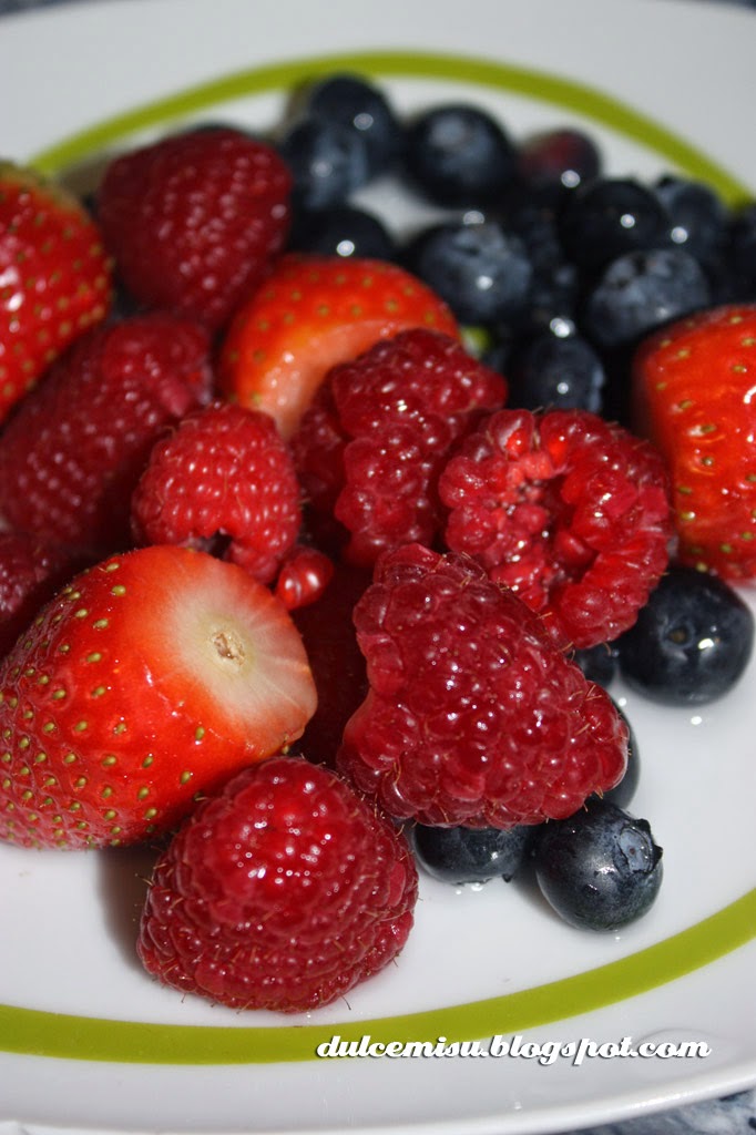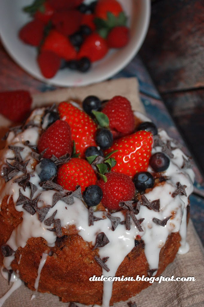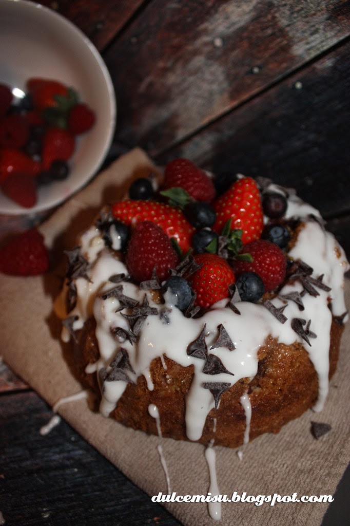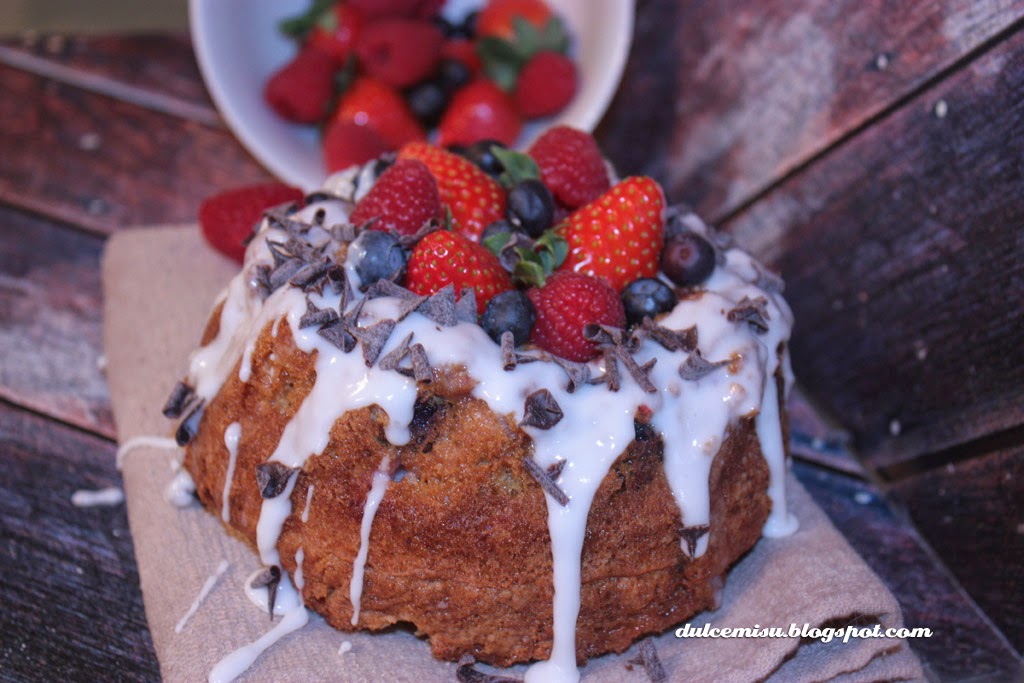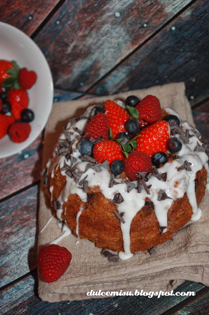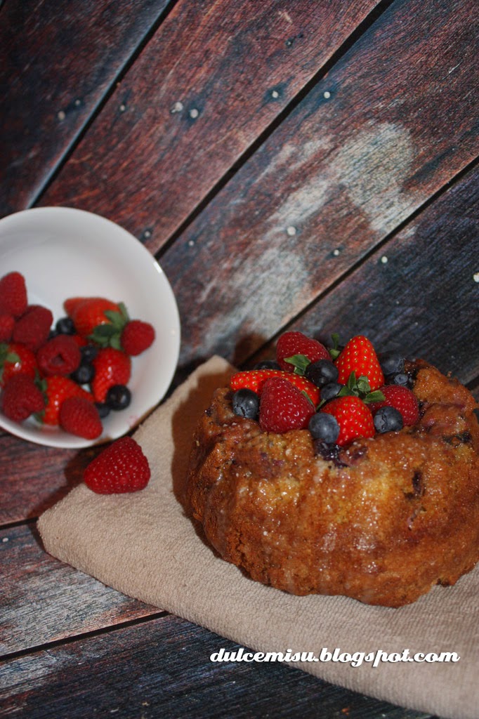 Estaba en la frutería y las vi, fresas, me chiflan las fresas, con esa pinta que tenían, y mi cabecita empezó a pensar opciones, me las llevo y las hago con nata, no, con leche, no, me las como solas, no, espera, ya lo tengo… un bundt cake… pero un bundt cake solo de fresas… con arándanos… y frambuesas… ya no había marcha atrás, se venían conmigo. Nada más llegar a casa me puse a ello, no por miedo a que las fresas se pusieran malas, sino por miedo a que desaparecieran misteriosamente, cosas que a veces pasan en mi nevera, en la vuestra no?