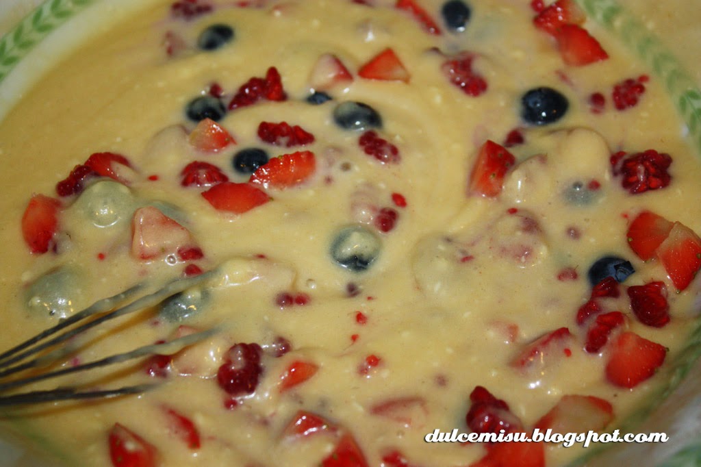 No echéis fruta en exceso o acabará bajando al fondo del molde por el peso y luego el bizcocho no quedará bonito. Añadimos las frutas a la masa, y mezclamos muy poco, para que la fruta no baje al fondo por el peso de la masa.