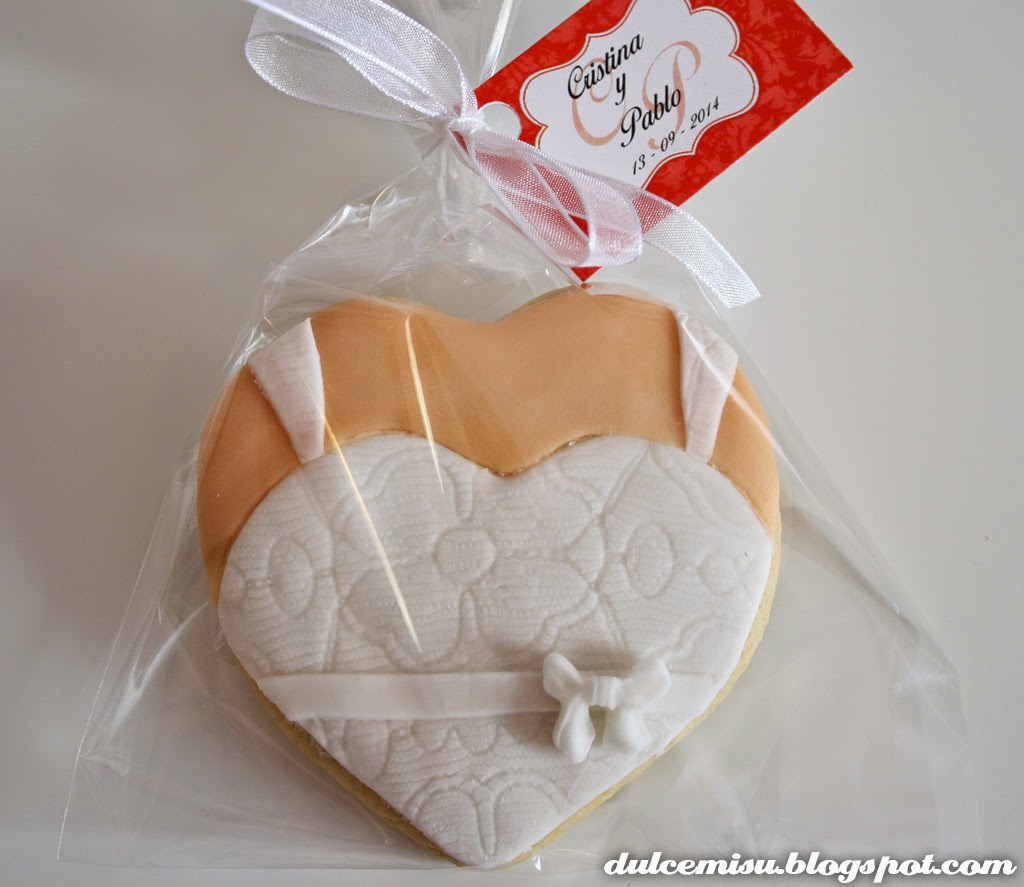 También hicimos galletas en forma de corazón que convertimos en vestidos de novia. No había ni un modelo igual, (esperamos que los invitados no se pelearán por elegir modelo 😉 )