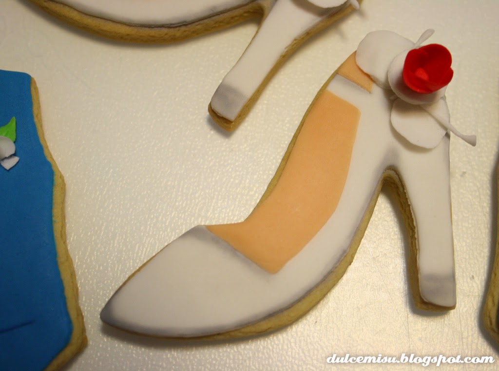 Alisamos con el rodillo de guías el fondant blanco y con el cortador que usamos para cortar las galletas cortamos la forma de zapato. También contáis con un amplío catálogo de sellos para galletas Nordic Ware para darle la forma que distinta dependiendo de los gustos de los invitados, en este caso, como Cristina quería un zapato más abierto y con tacón más fino, cortamos a mano la forma en la galleta y en el fondant.