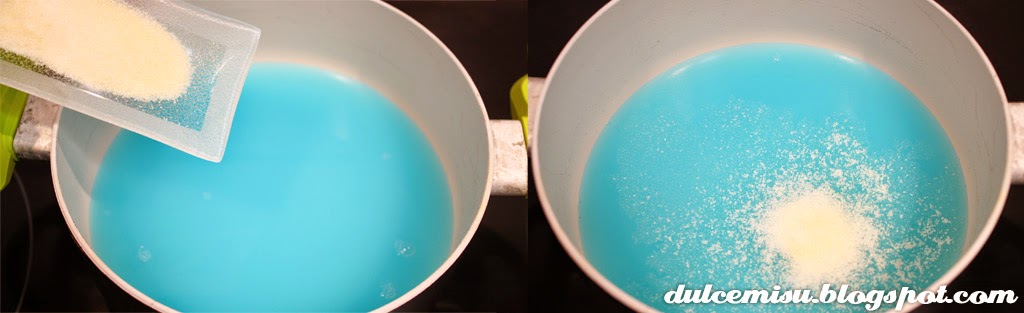 En un cazo ponemos a hervir el blue tropic con el sobre de gelatina, removiendo con la espátula de vez en cuando para evitar que se pegue.