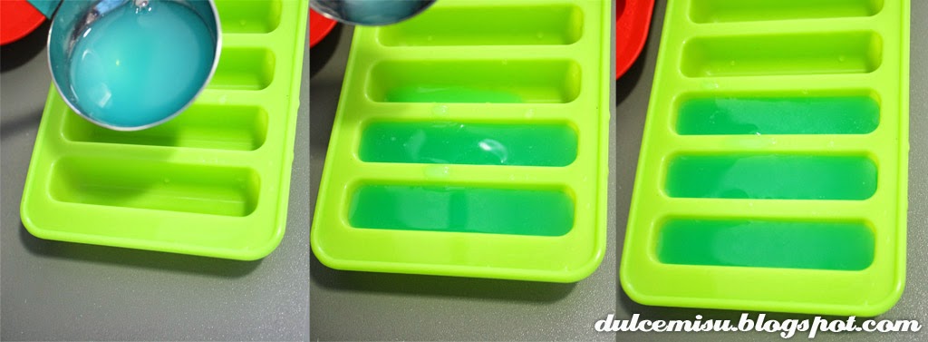 Antes de que la gelatina se enfríe demasiado, lo pasamos a los moldes que hayáis elegido, y enfriamos en la nevera entre 30 y 50 minutos, hasta que este completamente sólida. Os recomendamos que utilicéis moldes de silicona para que luego no haya problemas con el desmoldado.
