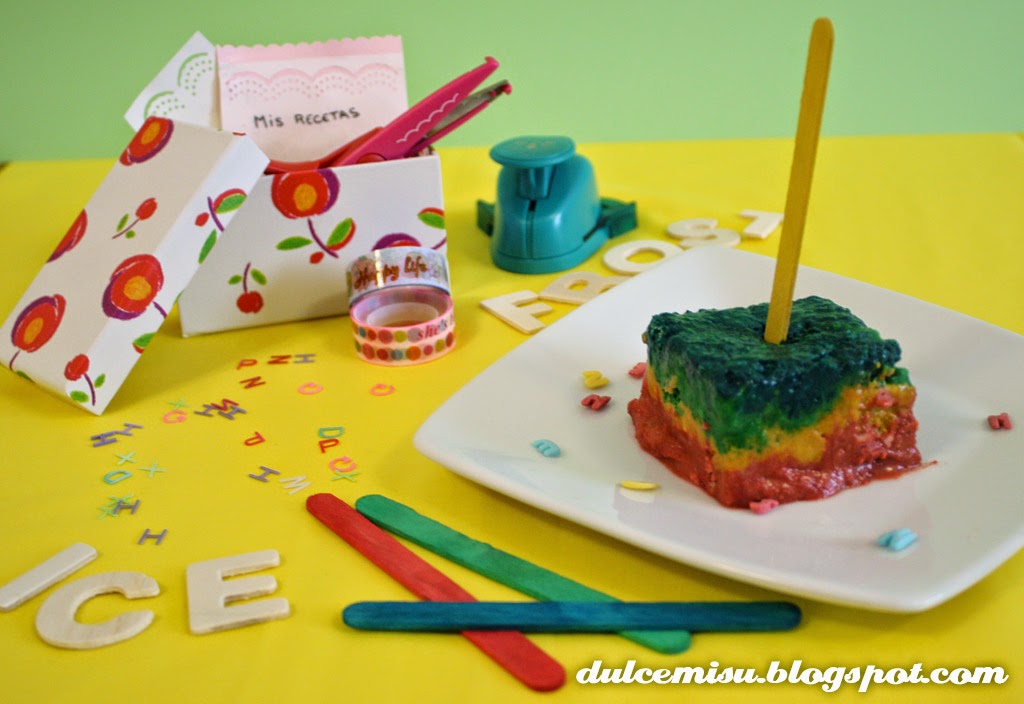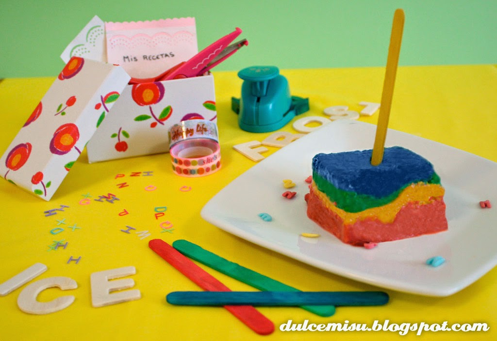 Hemos puesto primero una capa del helado rojo, la hemos aplastado bien. Continuamos con el helado amarillo, el verde y el azul. Acordaros de entre capa y capa compactar bien el helado.