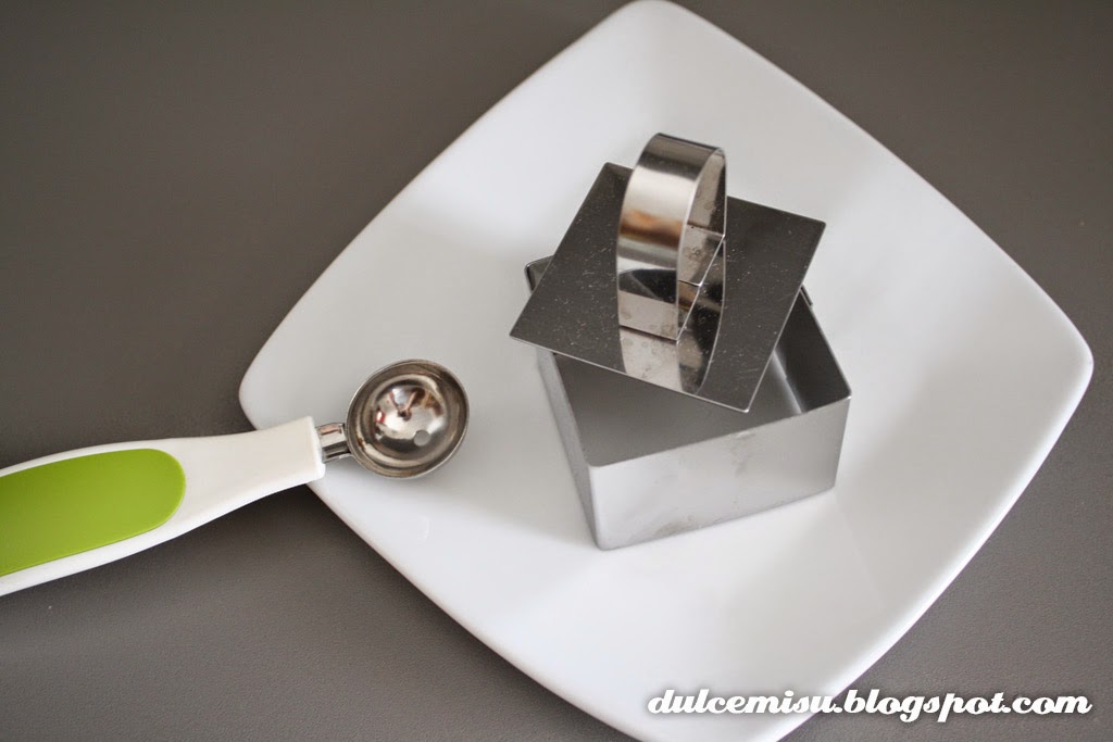 Para montar el plato hemos usado un molde cuadrado y nos hemos ayudado con el sacabolas para rellenarlo.