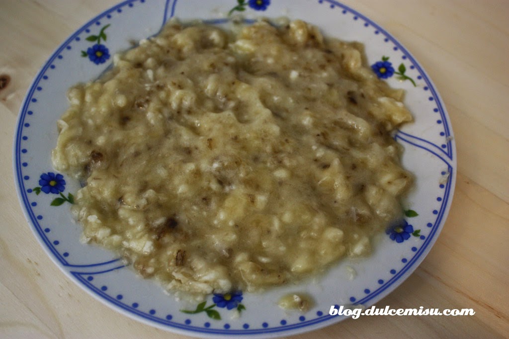 A continuación, en un plato aparte, vamos triturando los plátanos. Podéis hacerlo con una batidora. Yo lo hice a mano, aplastandolos con un tenedor. Así consigo que no quede echo batido, y se note un poco de tropezón, pero esto es al gusto.