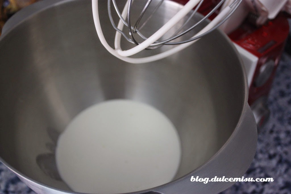 Lo primero que vamos a hacer es montar la nata. Es importante que la nata esté fría, y que contenga un 35% de materia grasa. Con unas varillas la vamos batiendo hasta que la nata esté montada. La endulzamos al gusto. A continuación, se le añade un chorrito de Baileys, en nuestro caso, 2 vasos de chupito, que equivaldrían a unos 50 ml. ¡Más vale que sobre, que no que nos falte!