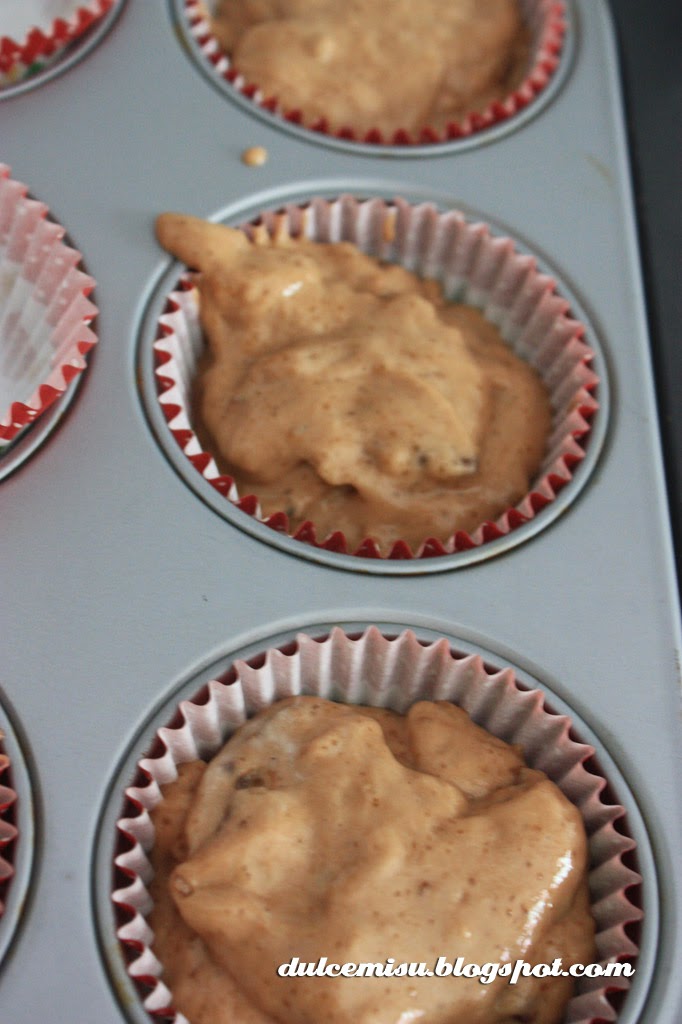 Ponemos nuestras capsulas en el molde para muffins y las rellenamos con la masa. Ponemos unos cereales por encima y los metemos al horno.