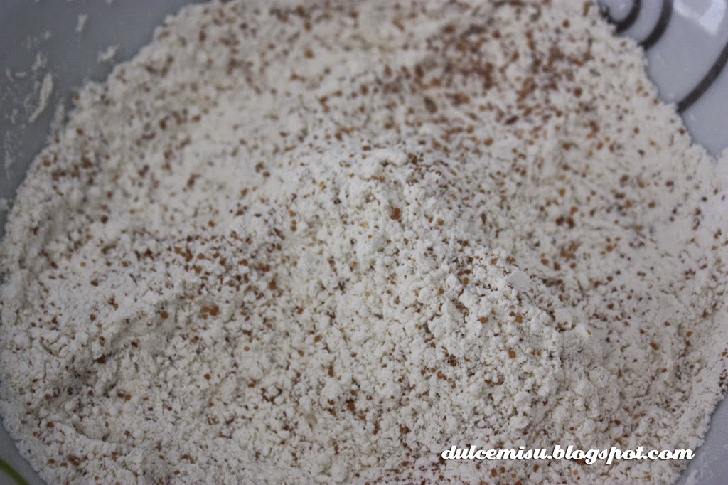 Ahora vamos con los sólidos. En otro bol mezclamos el azúcar moreno, la harina, el bicarbonato y la levadura.