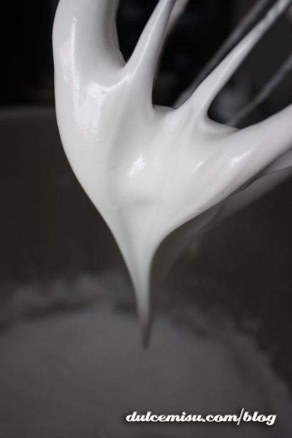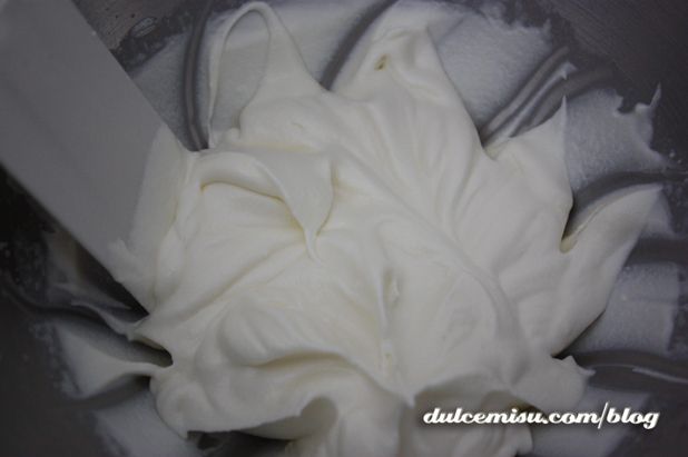 Cuando las claras hayan montado añadimos la mitad del azúcar y seguimos batiendo. Veréis como las claras van cogiendo un tono blanquísimo y brillante.