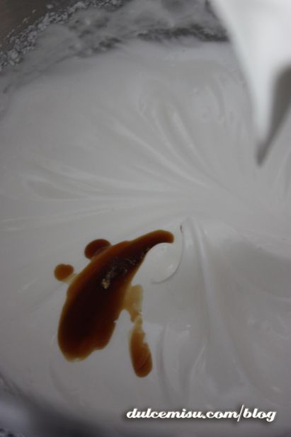 El resto del azúcar lo mezclamos con la maicena y lo vamos añadiendo poco a poco. Incorporamos el aroma de vainilla y seguimos mezclando. Y ya tenemos el merengue listo.