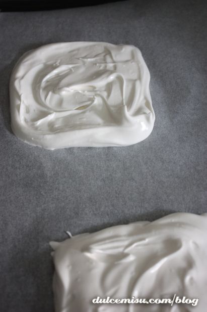 Ahora en la bandeja del horno ponemos papel encerado o para hornear y ponemos el merengue con una espátula dándole la forma que queramos que tenga nuestra pavlova. Para que todos los pisos tengan la misma forma podéis dibujar la forma en el papel así es más fácil. Yo lo hice a ojo.
