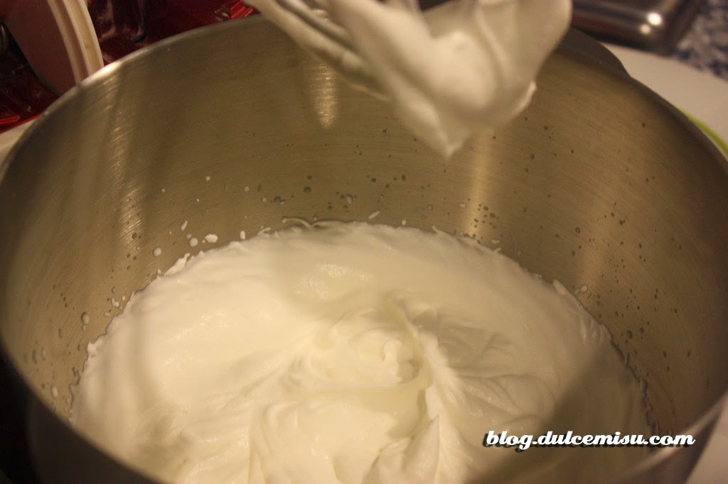 Lo primero que hay que hacer es montar las claras a punto de nieve. Cuando estén listas añadimos la mitad del azúcar.