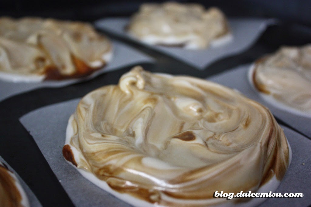 Con una espátula extendemos el merengue sobre el papel de horno en forma de círculos, podéis dejarlos lisistos o intentar hacer alguna forma para que queden más chulas. Nosotros queríamos darle un toque de color al merengue, sin que quedase uniforme, así que con una cuchara vamos añadiendo el café a cada círculo sin dejar que se integre del todo, así quedará como marmolado, con más tonos por unos lados que por otros.