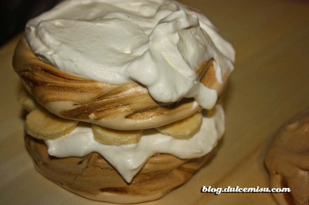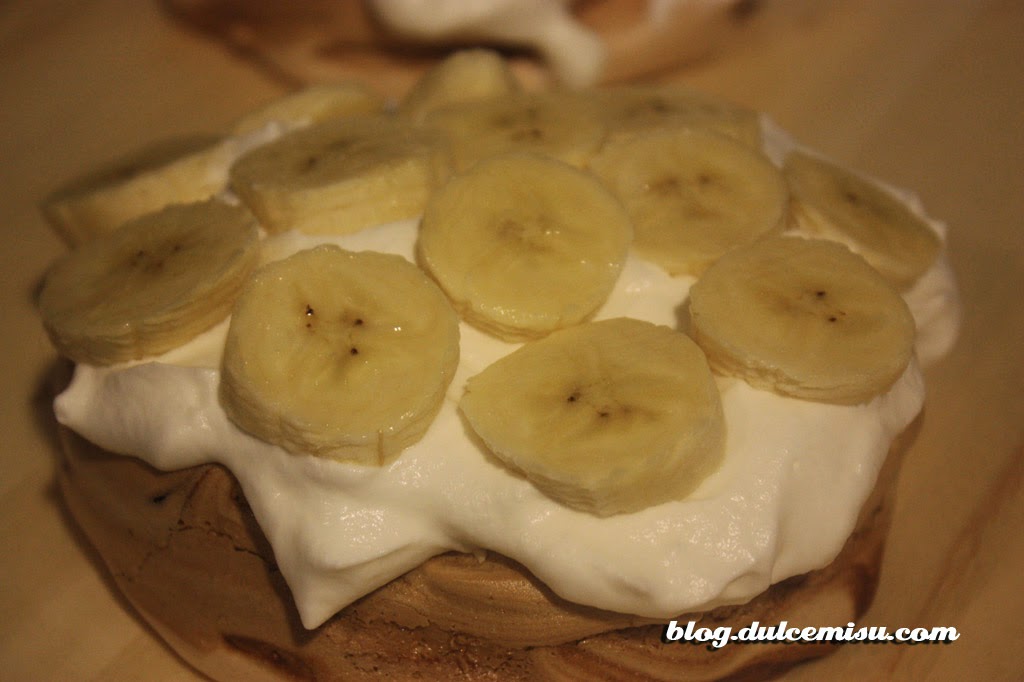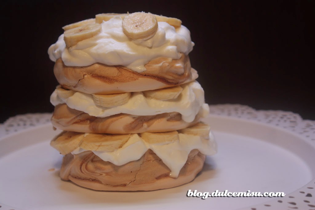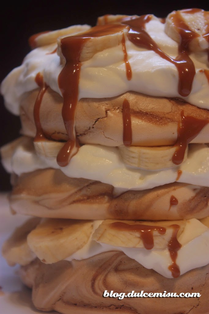 La receta de hoy es una pavlova de café con plátano y dulce de leche. Las pavlovas me encantan, su textura es tan ligera que las hace ideales como postre. La combinación del café con el plátano ha sido un acierto, y el toque de dulce de leche pues que os voy a contar… También hemos puesto nata montada entre las capas, y el resultado ha sido increíble.