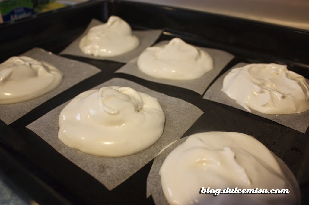 Ahora toca hacer las bases. Esto ya como mejor os apañéis. Podéis colocar papel de horno sobre la bandeja y echar el merengue a ojo o podéis cortar círculos de papel con la medida para que todas las capas sean iguales, o marcáis los círculos sobre el papel sin cortarlo….