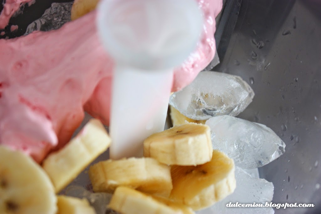Pelamos los plátanos y los troceamos. En el recipiente de la batidora añadimos los plátanos, el resto de hielo y otras dos o tres cucharadas de Fluff al gusto y trituramos hasta que queden mezclados los ingredientes. Si queréis más sabor a plátano o a nubes podeis echar una gotita de aroma.