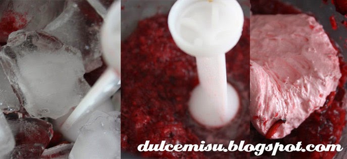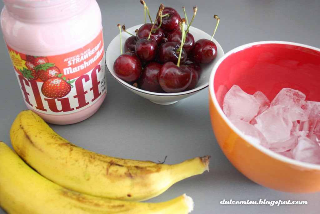 En el recipiente para triturar de la batidora añadimos las cerezas, la mitad del cuenco de hielo y dos o tres cucharadas grandes de Fluff según lo goloso que seas. Trituramos los ingredientes hasta que estén unificados sin eliminar del todo los trocitos de hielo para que nos aguante más tiempo fresquito.