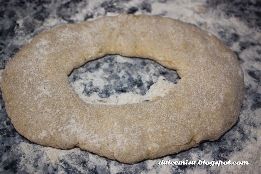 Cuando la masa haya levado el doble de su volumen la ponemos sobre una superficie enharinada hecha una bola. Metemos los dedos en el centro y vamos haciendo un agujero. Luego vamos girando la masa para conseguir la forma deseada. Volvemos a dejar levar la masa.