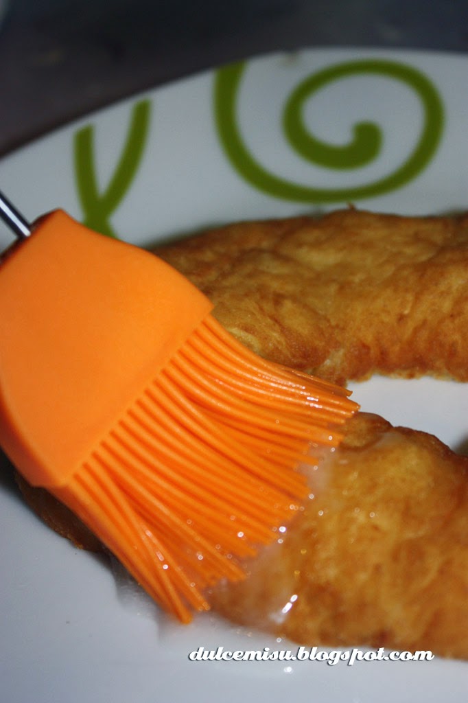 Preparamos un poco de glaseado, con nata liquida y azúcar glas, simplemente mezclándolos hasta que no haya grumos. Cuando lo tengamos listo cogemos la parte de arriba del roscón y la glaseamos con un pincel de silicona.