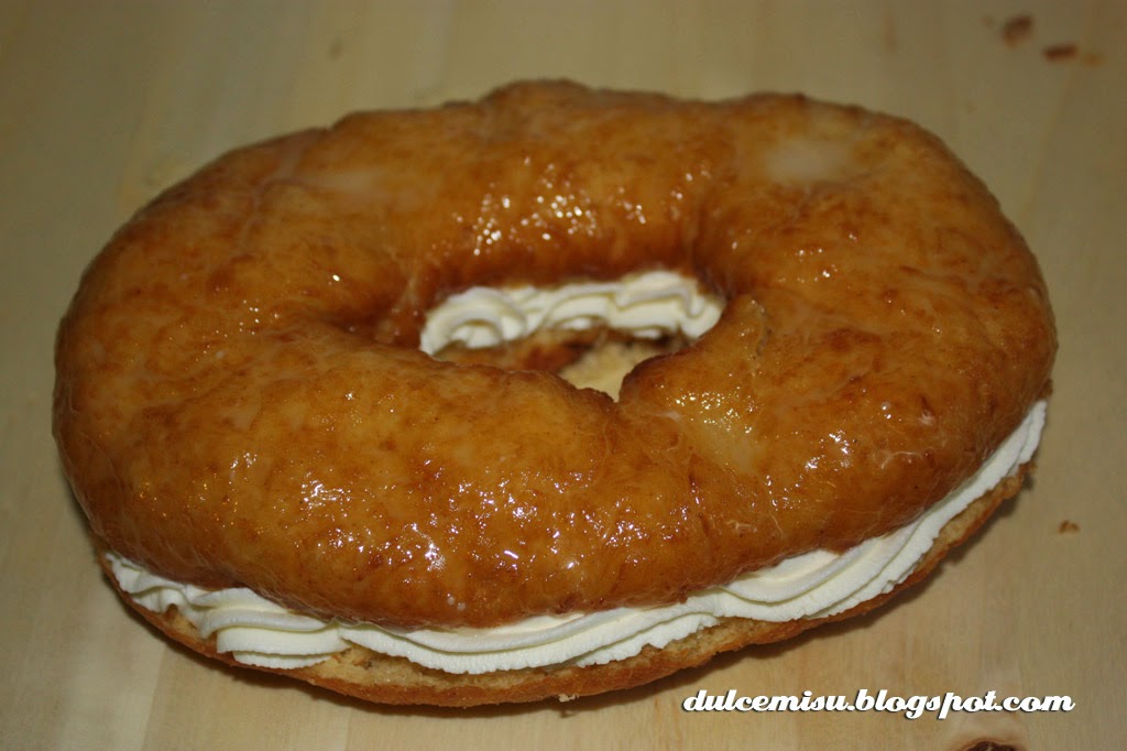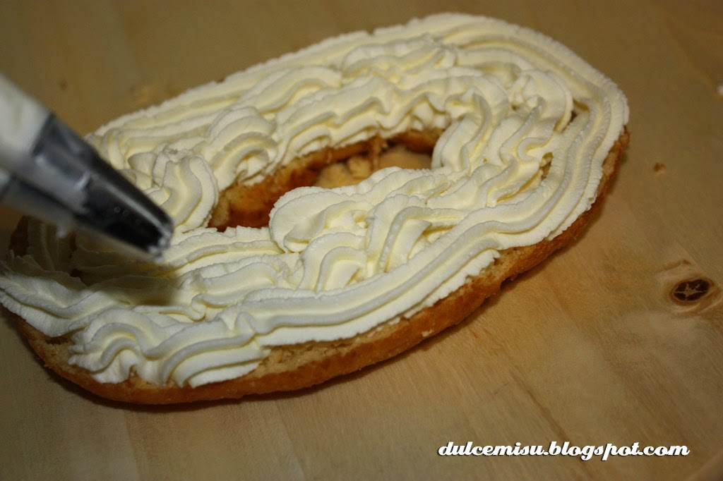 Con una manga pastelera vamos poniendo la nata sobre la parte de abajo del roscón hasta que este totalmente cubierta y le ponemos la parte de arriba. Ya sé que os lo comeríais tal cual, pero todavía hay que decorarlo.