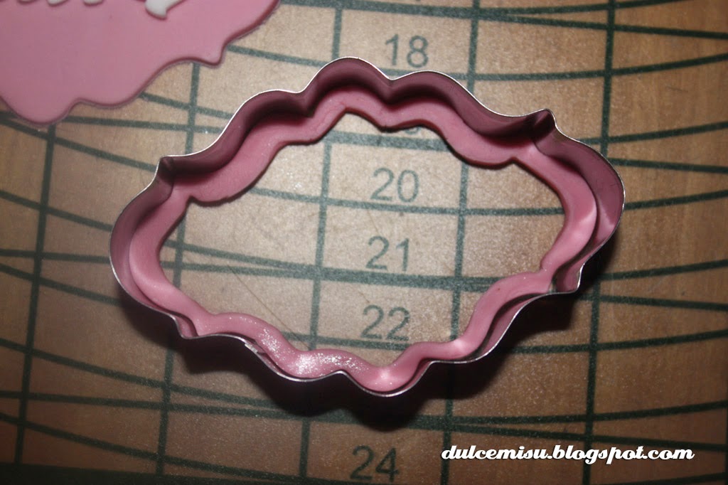 Lo primero que hice fue el marco con el nombre. Para ello estiré fondant rosa y corté la forma con un cortador. También corté un borde ayudándome del cortador.