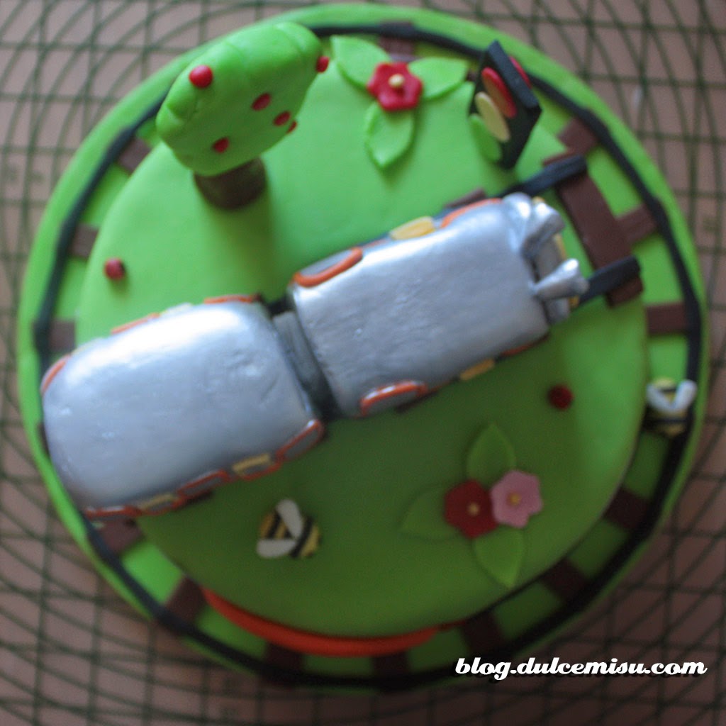 A Emery, le hice el día de antes, para que fuese secando. Lo hice completamente de fondant, con la idea de que lo guardase para el recuerdo, en vez de que se lo comieran. A parte, como me dijo el padre, cortar a Emery hubiera sido un drama… Lo pinté con pintura comestible plateada, aplicada con un pincel. Cuando estuvo seco lo coloqué sobre las vías.