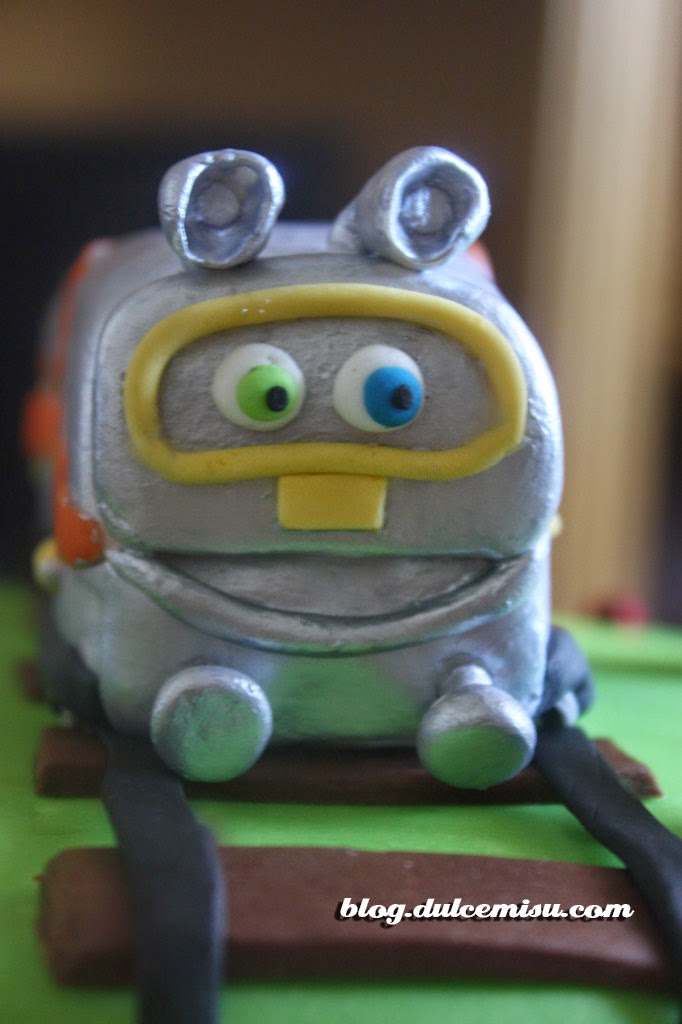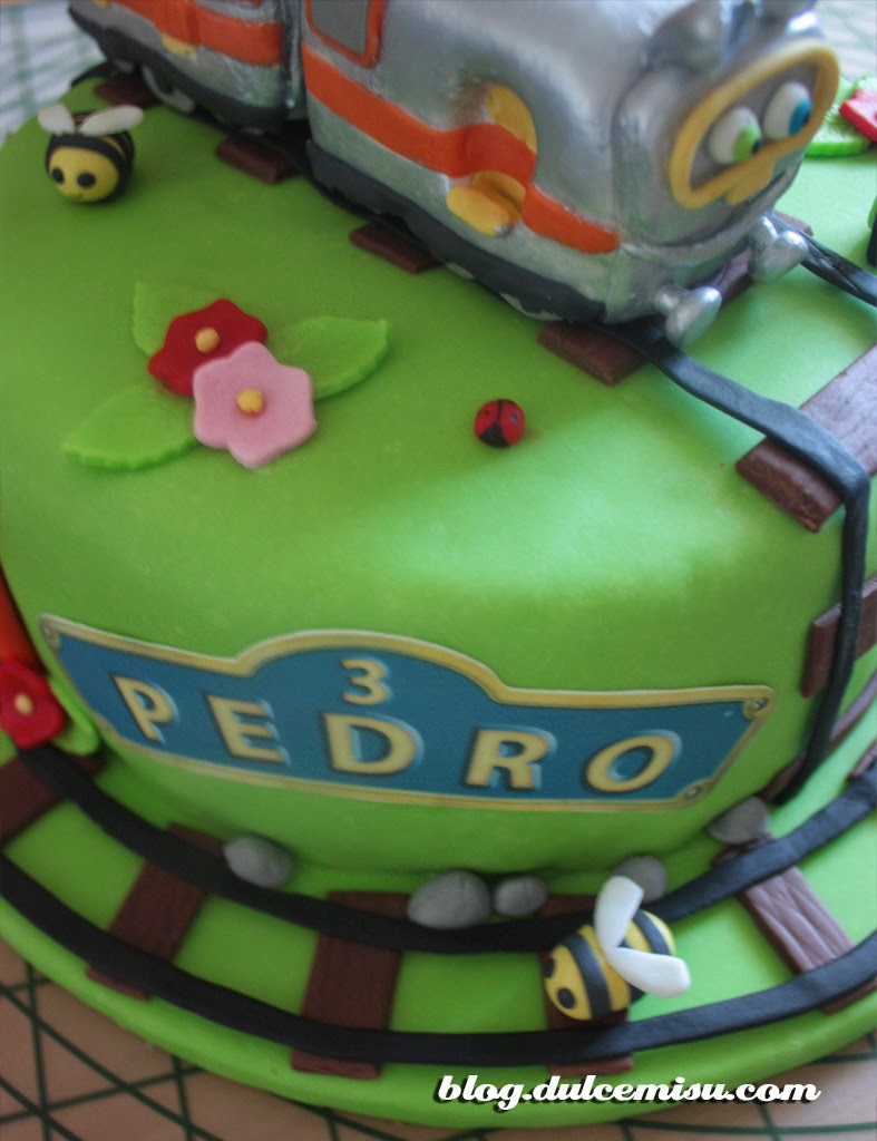 Hoy os quería enseñar esta tarta que me encargaron unos amigos para el cumple de Pedro, su tercer cumpleaños. La tarta tenía que ser de la temática de sus dibujos favoritos, los Chuggington, unos dibujos animados sobre trenes, y en especial su personaje preferido, Emery. Yo no conocía estos dibujos, así que a raíz de una imagen de Emery creé esta tarta.