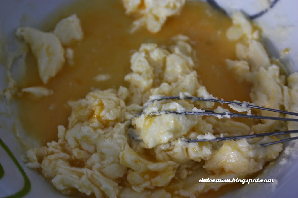 En un bol mezclamos la mantequilla con el azúcar y añadimos los huevos. Mezclamos bien. Y también añadimos la vainilla.