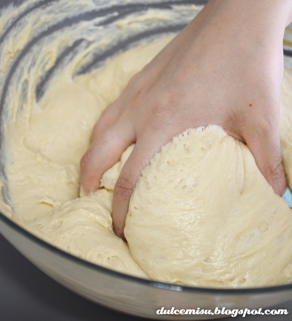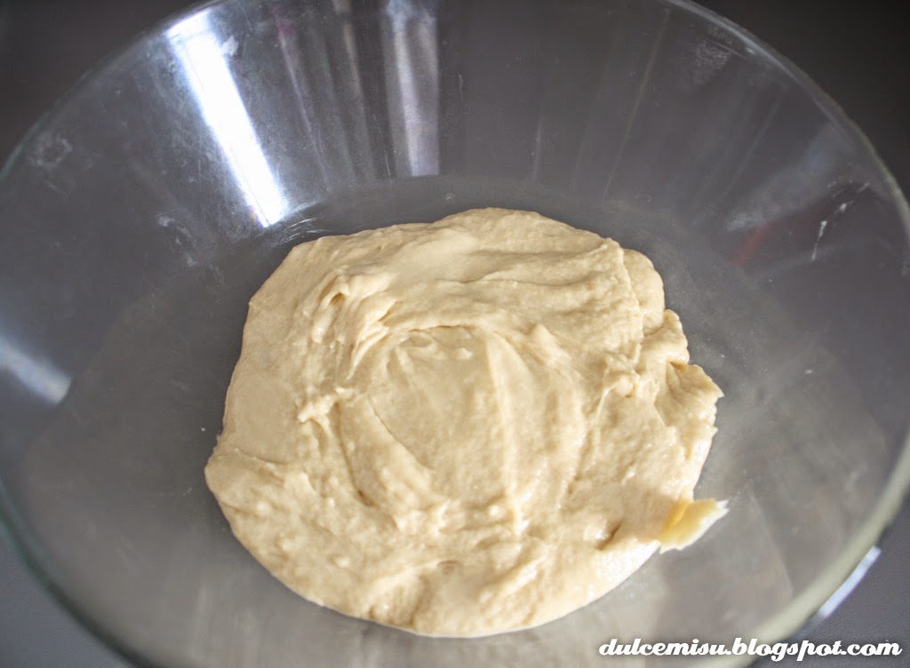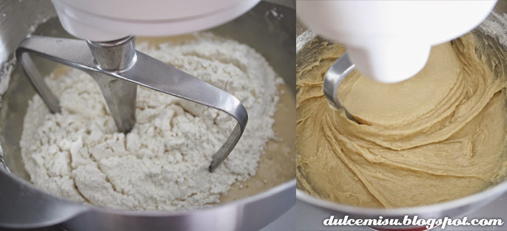 Añadimos el resto de harina y cambiamos las varillas por la pala. Después de 5 minutos a velocidad máxima tendremos una masa