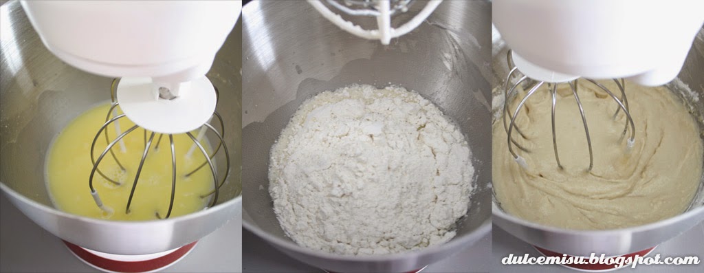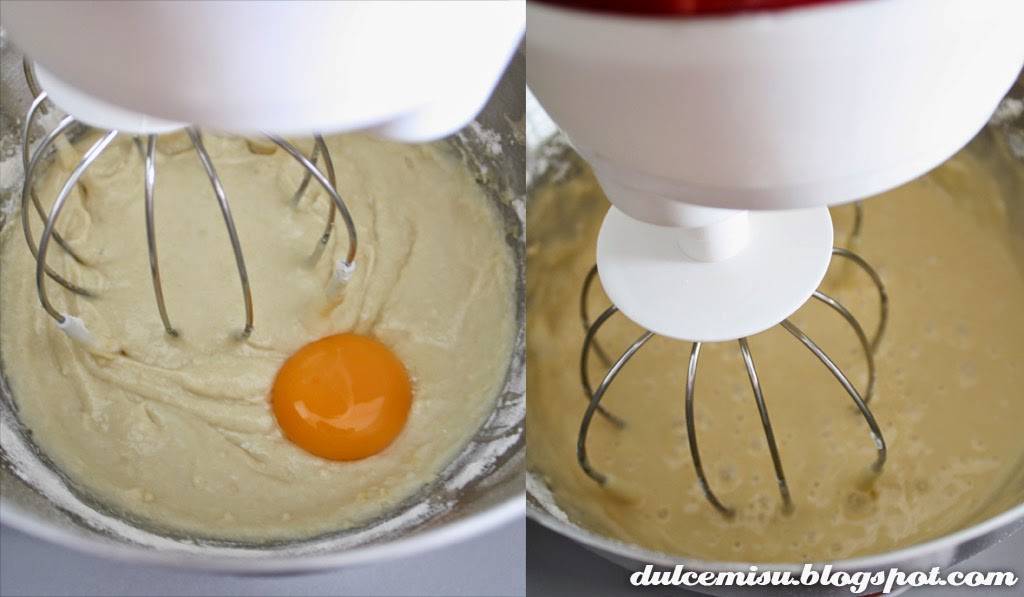 Incorporamos los huevos uno a uno, batiendo a velocidad baja. Cuando terminemos de incorporarlos y estén mezclados, batimos un par de minutos a velocidad alta, hasta conseguir una crema sin grumos.