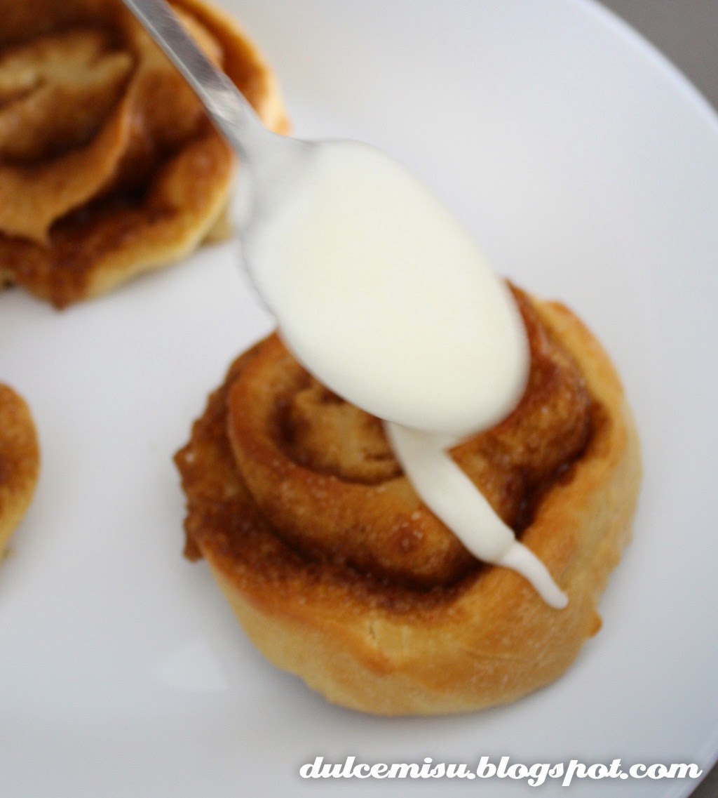Cuando esté listo el glaseado, cubrir los rollitos completamente, o bien, los podéis decorar con unas líneas. Las líneas las podéis realizar con una cuchara, o como mejor os apañéis.