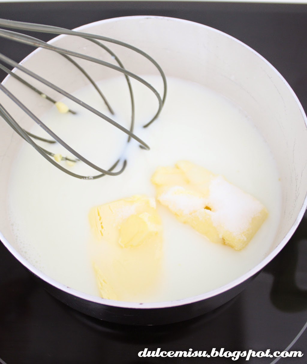 Empezamos calentado en un cazo la leche, la mantequilla, la sal y el azúcar. Removemos hasta que se derrita por completo la mantequilla.