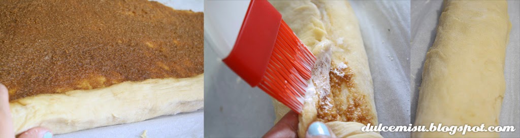 Al empezar a enrollarla, lo más fácil es que la primera vuelta os ayudéis con el papel vegetal, así no se romperá la masa, podréis apretarla más para que se pegue bien y no quede aire dentro. Cuando terminemos de enrollarla, en el extremo que queda, lo pintamos con un pincel de silicona con un poco de nata líquida, así se quedará el borde pegado.