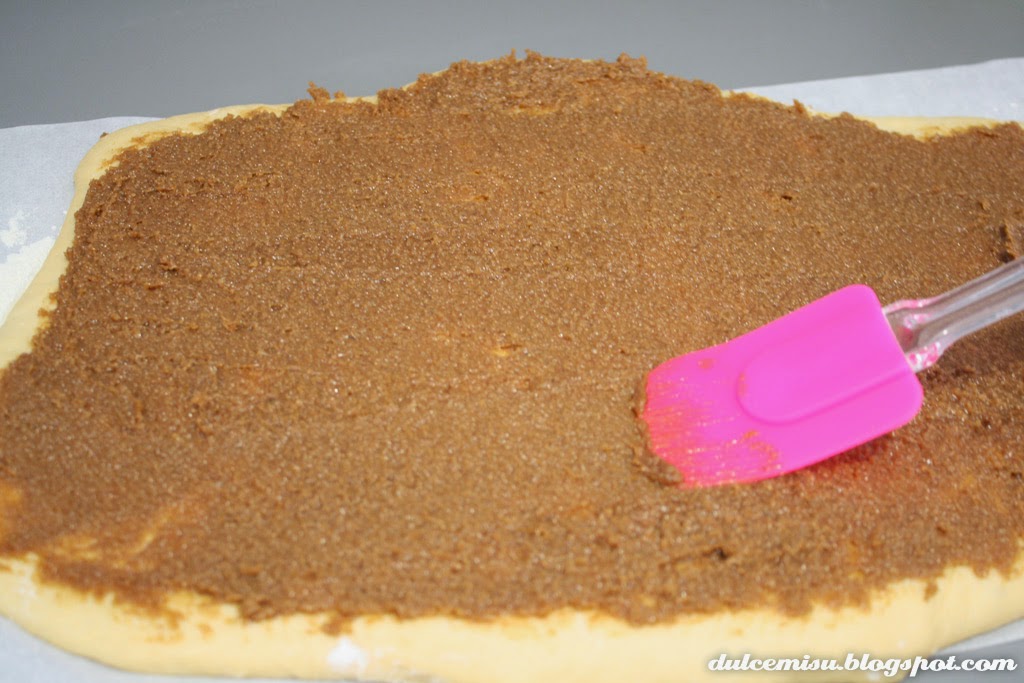 Repartimos el relleno por toda la superficie con la ayuda de una espátula y empezamos a enrollar la masa.