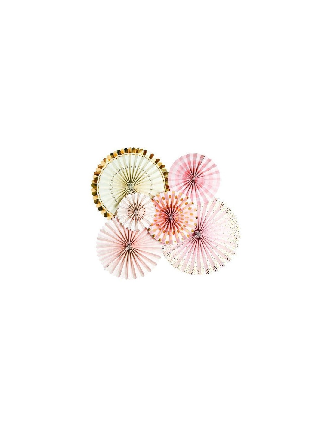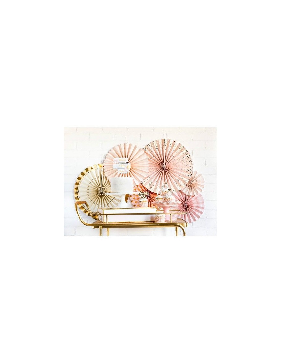Juego de 8 abanicos de papel de doble cara rosas y dorados y un tubo de confeti en tonos rosas champagne y dorados ideales para dar un toque especial y original a tus fiestas.