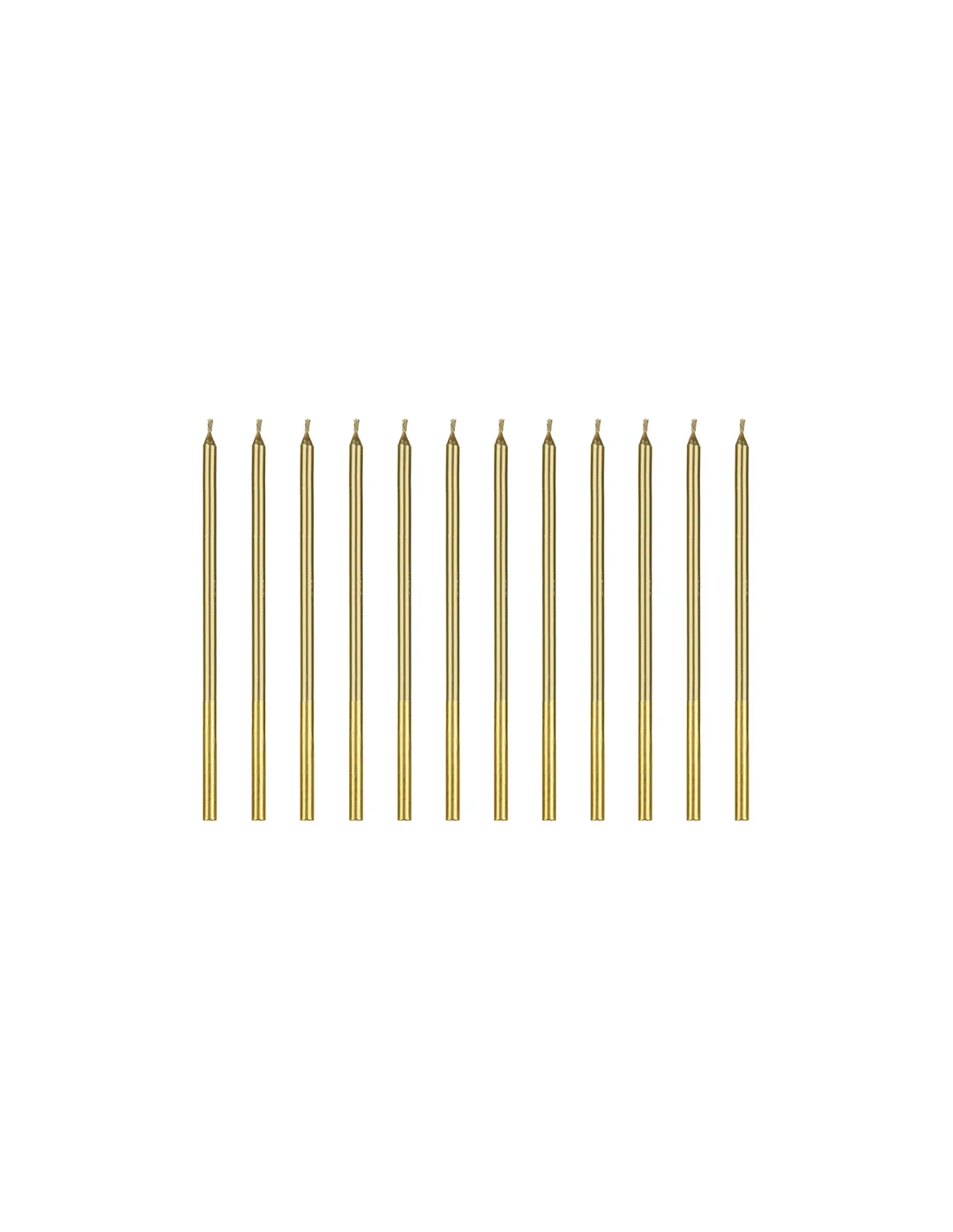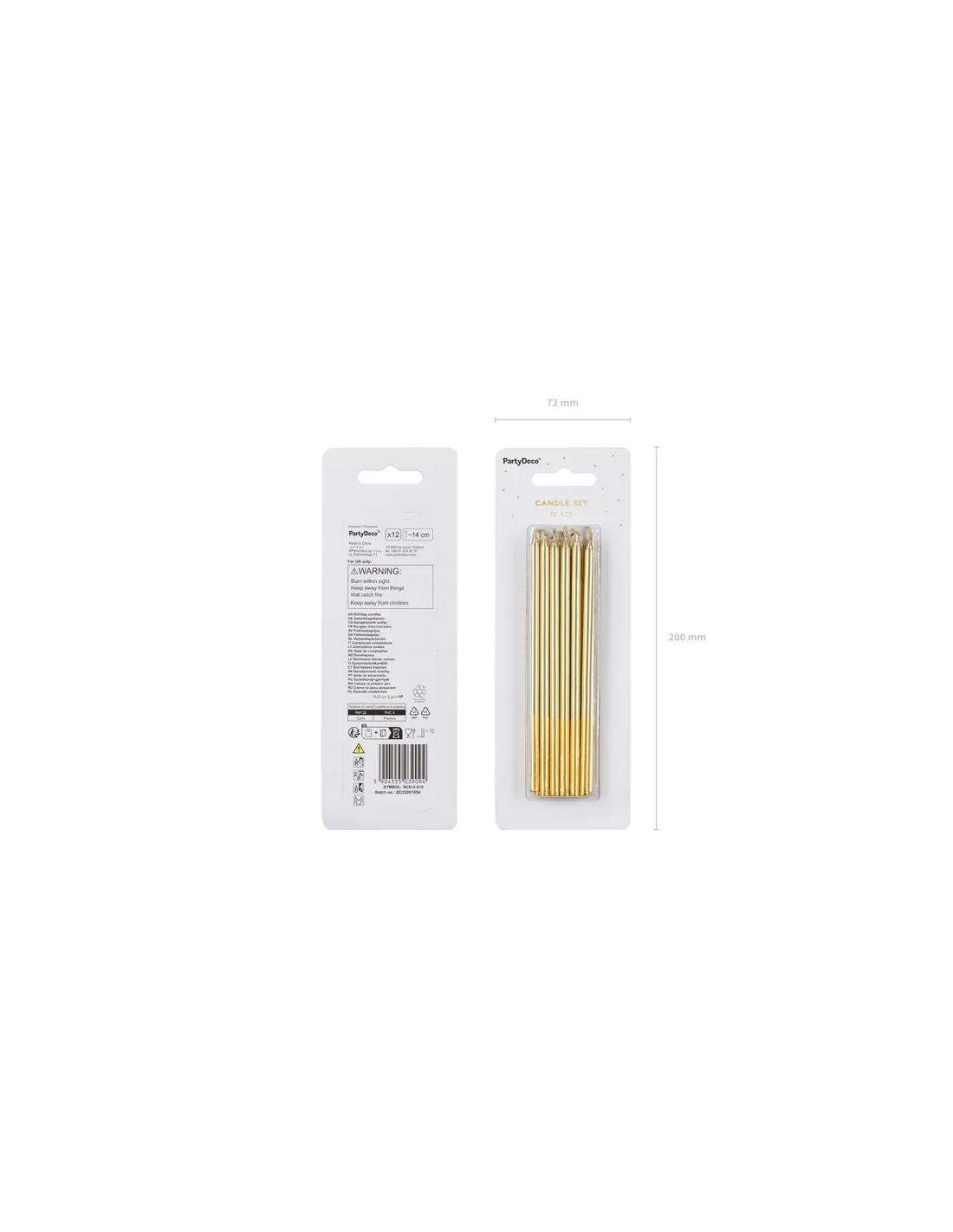 Decora tus tartas de cumpleaños con este set de 12 velas doradas de 14 cm de alto.