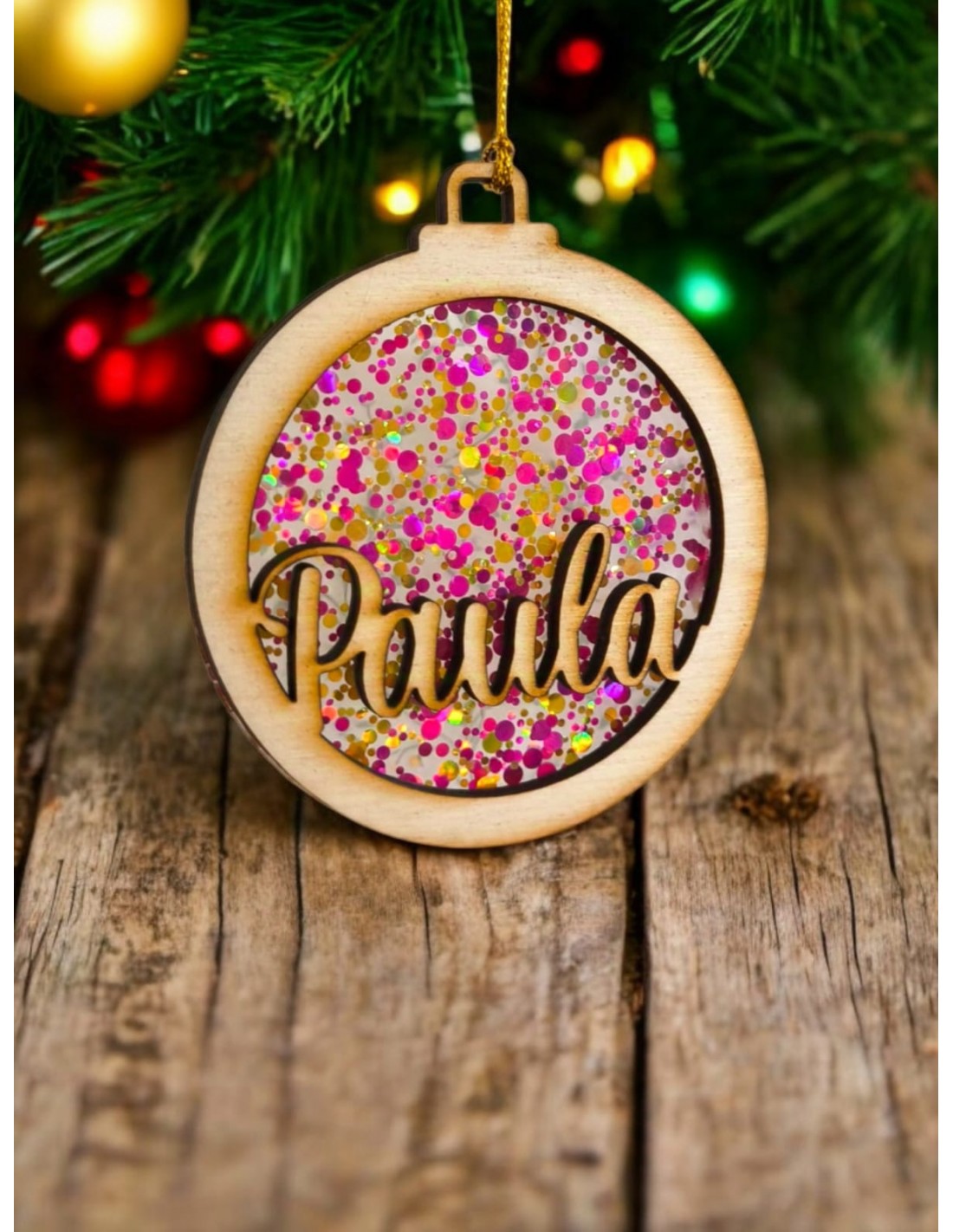 Bola de madera con nombre personalizado y con círculo acrílico de confeti.