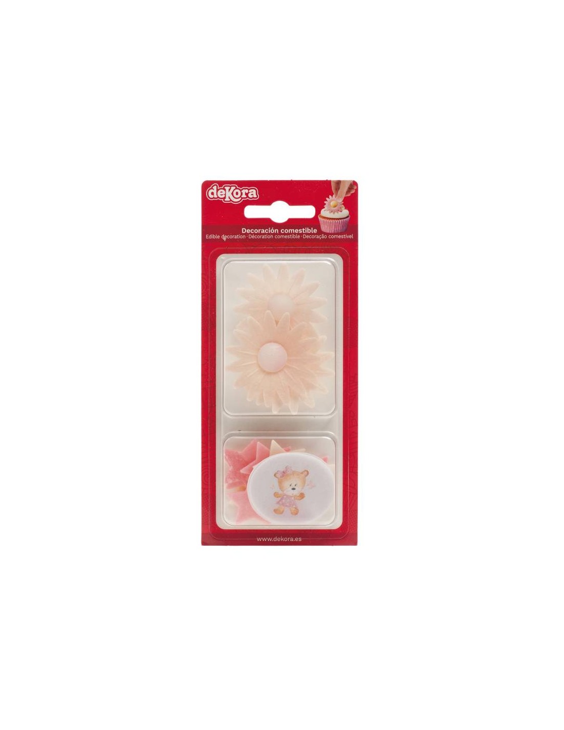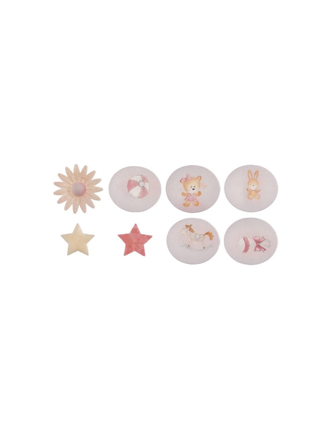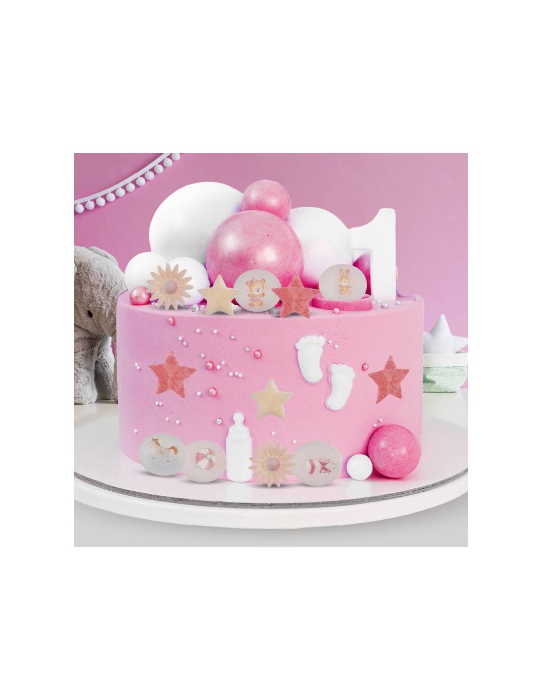 Surtido de obleas, margaritas y estrellas en tonos rosas con temática de bebé, ideales para decorar tus tartas o cupcakes. Tienen un delicado diseño que hará que tus dulces queden perfectos.