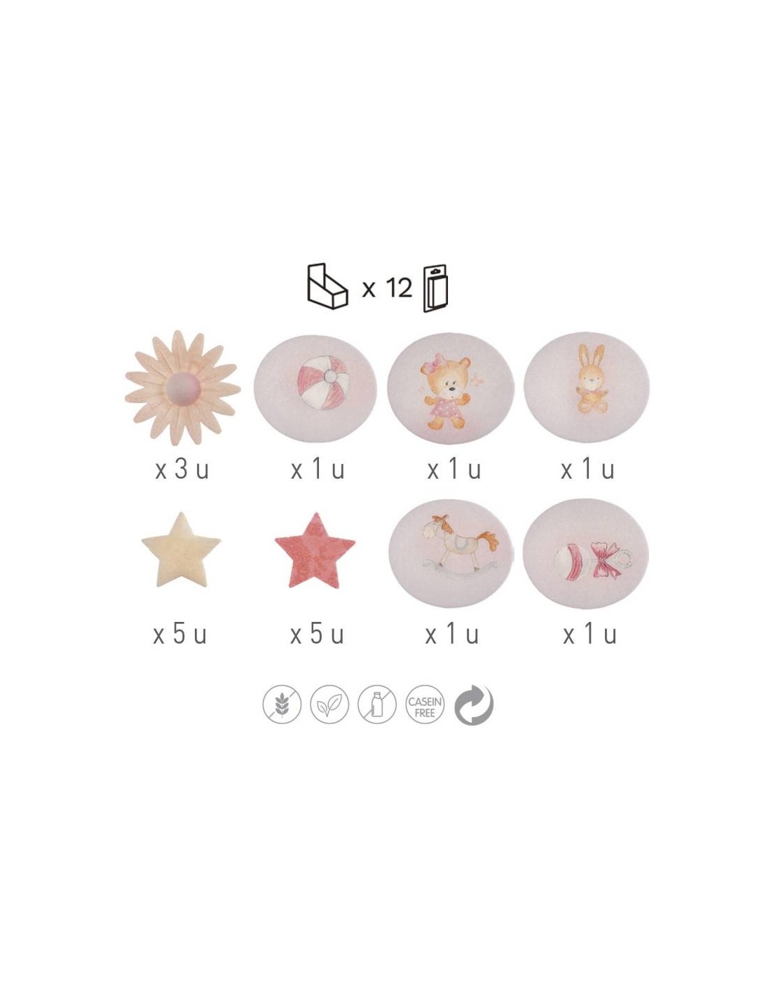 Contiene 5 círculos de oblea con dibujos variados, 3 margaritas de oblea, 5 estrellas beige y 5 estrellas rosas de oblea.