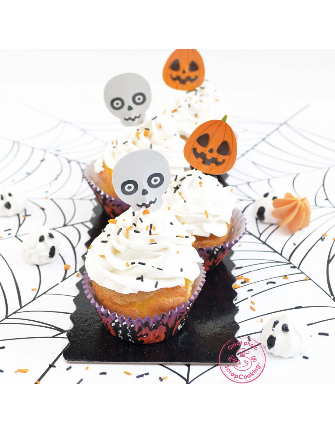 Da a tus cupcakes un toque divertido con estas capsulas de Toppers Calabazas y calaveras Halloween para cupcakes.