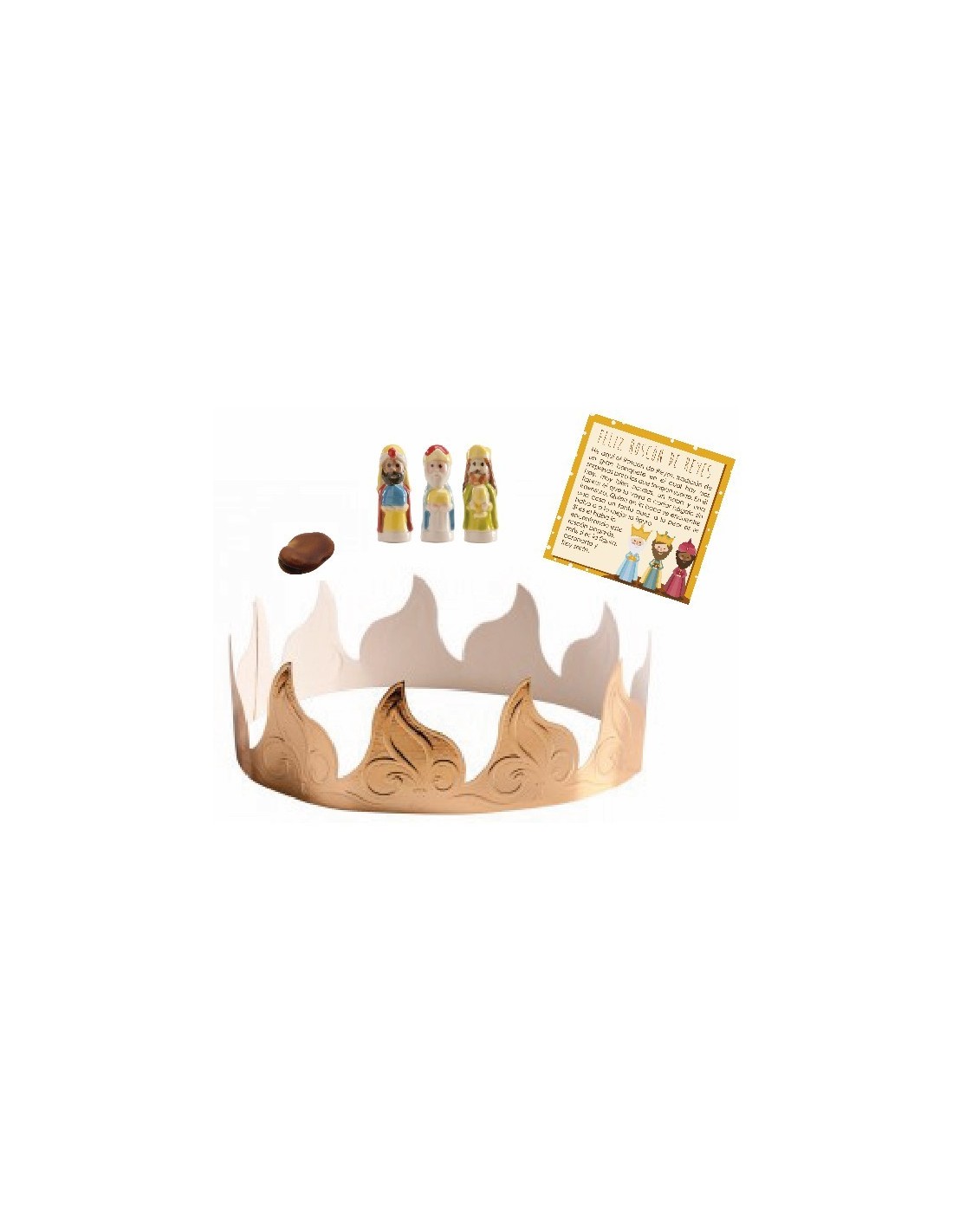 Pack para completar tu roscón de reyes que incluye una corona de cartón + haba + una figurita de rey mago + una tarjeta.
