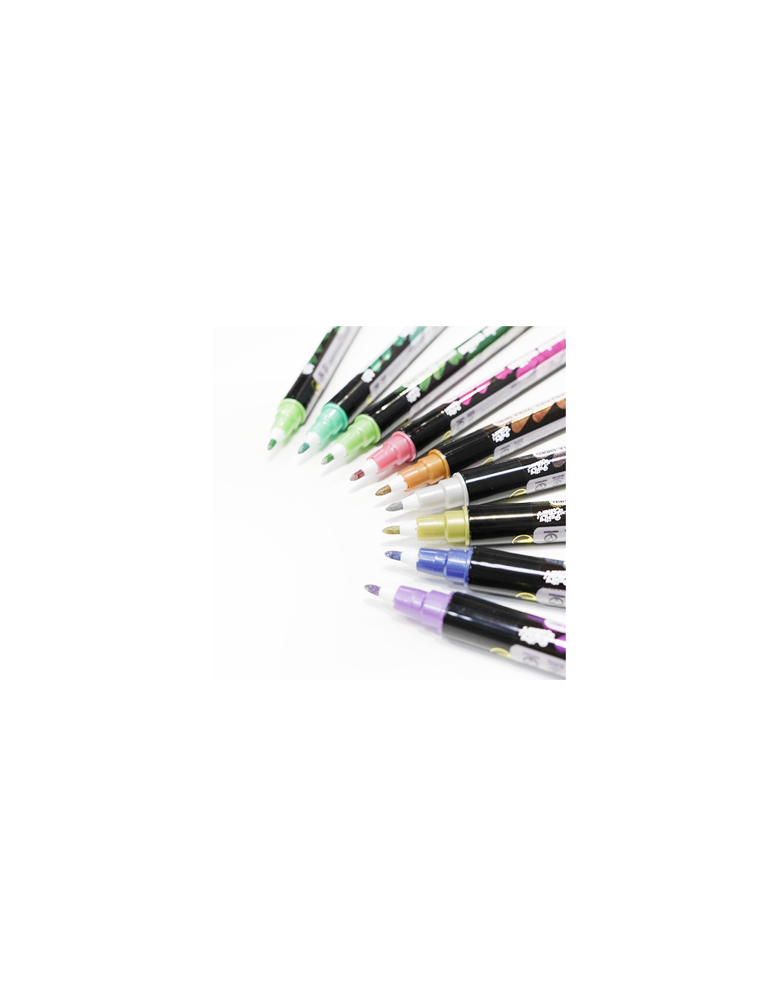 El rotulador está diseñado con dos puntas distintas para adaptarse a diferentes necesidades de decoración: una punta fina para detalles precisos y una punta gruesa para líneas y rellenos más amplios. La tinta de base acuosa se seca rápidamente, evitando borrones y asegurando un acabado limpio y brillante.