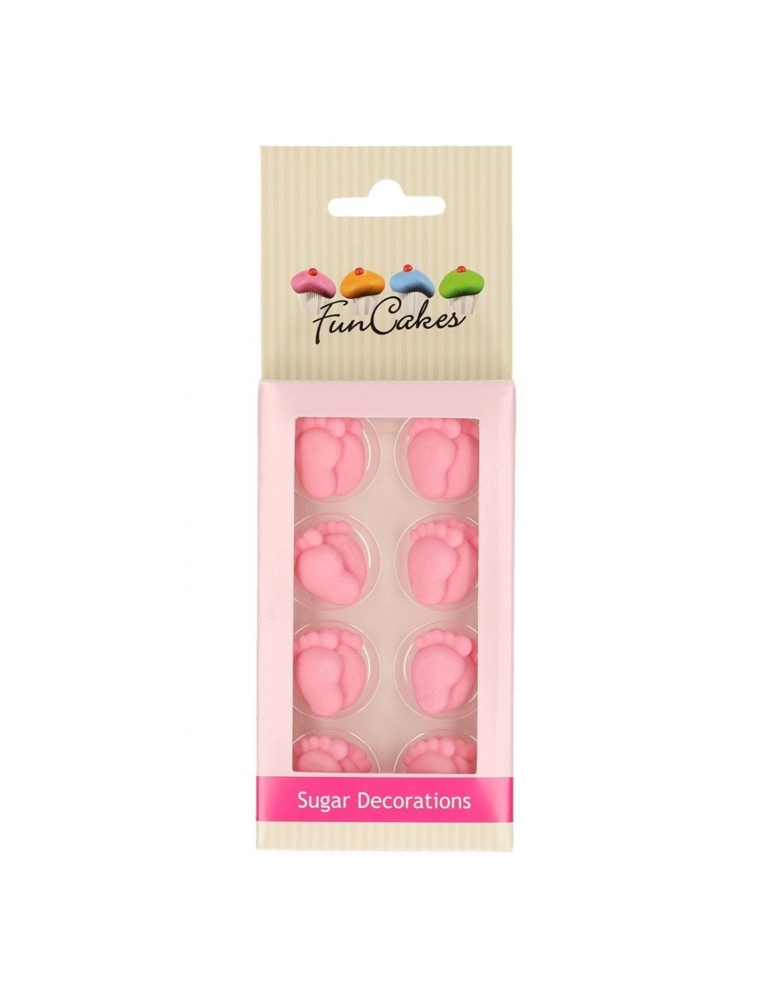 Contiene 16 figuritas pies de bebé de azúcar en color rosa.