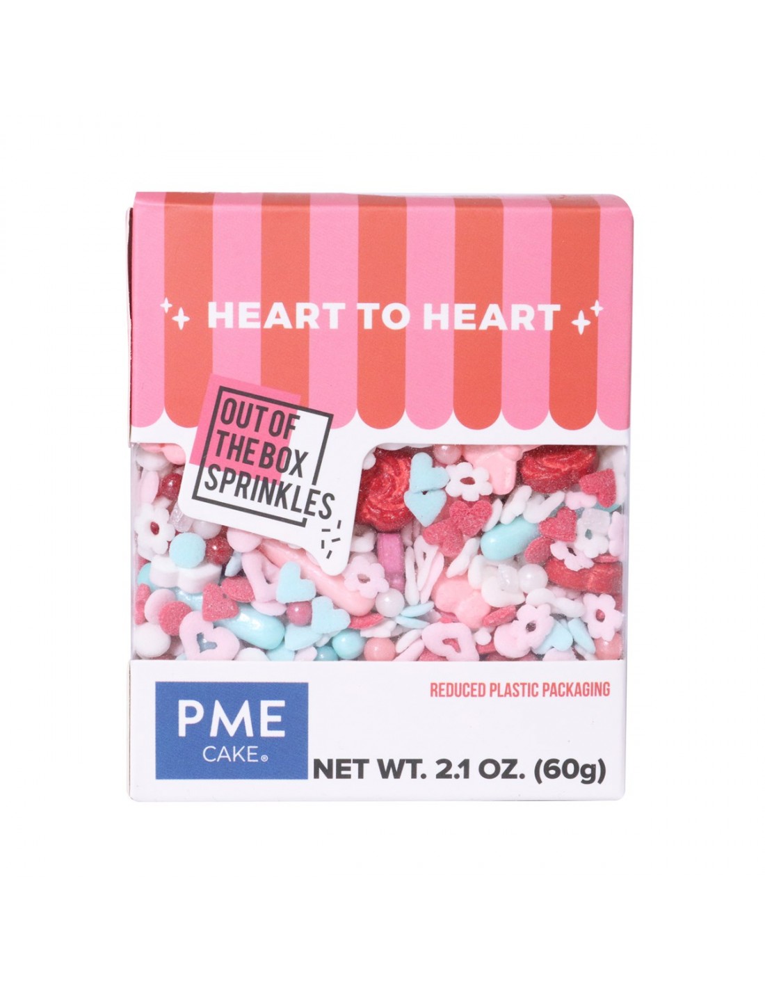 Los Sprinkles Heart to Heart de la marca PME vienen presentados en una caja de 60gr y están compuestos por una mezcla de corazones, rosas, confites palitos xl... en tonos azul, rosa y rojo.