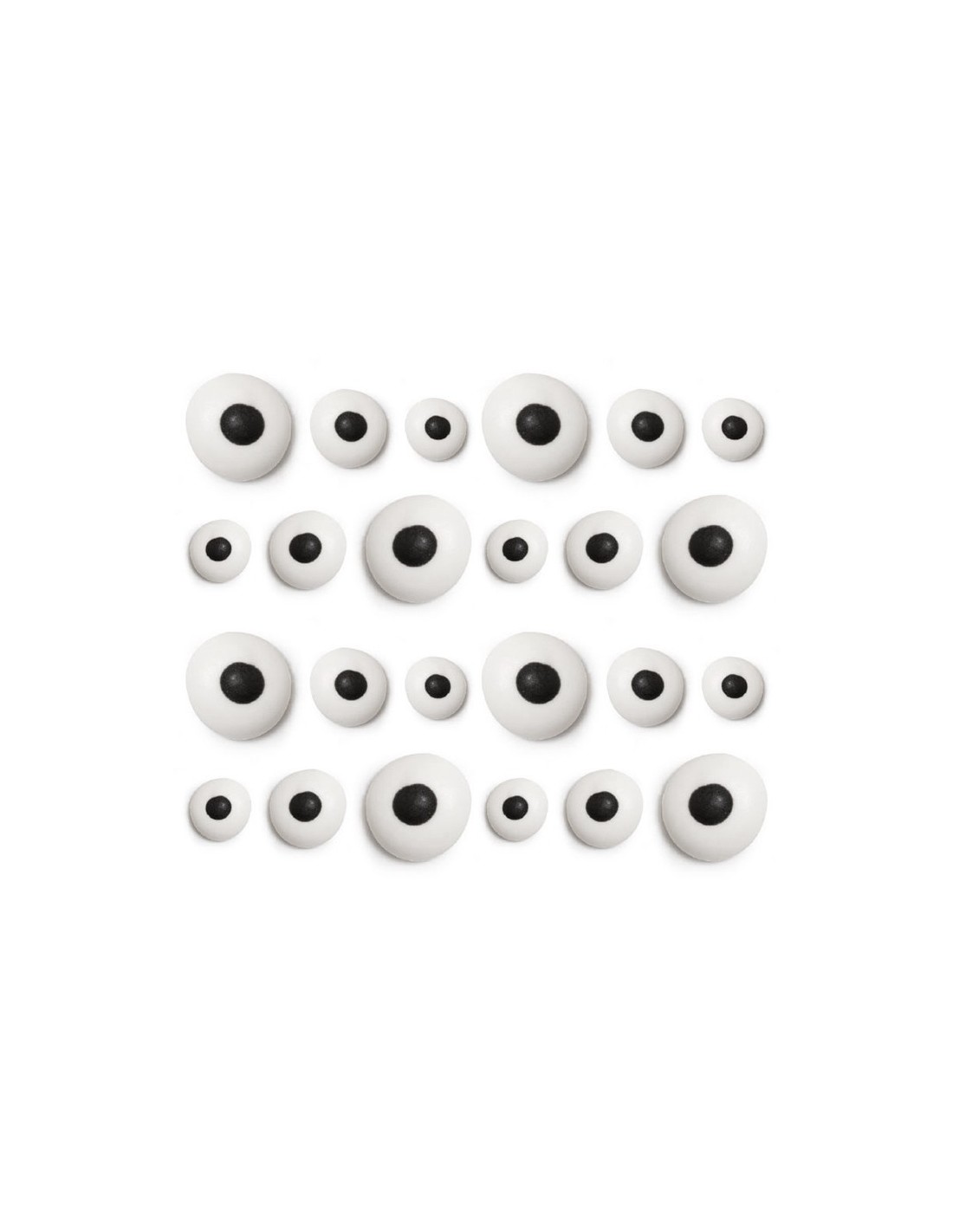Contiene: 12 ojos de 0,5 cm aprox. 10 ojos de 1cm aprox. y 8 ojos de 1,5 cm aprox.