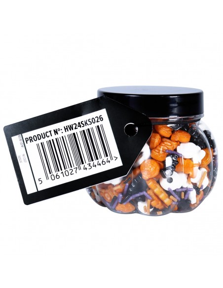 136g de mezcla de sprinkles en una hechizante combinación de calabazas, murciélagos, fantasmas, ojos de 10 mm, y chispas negras, naranjas y moradas.