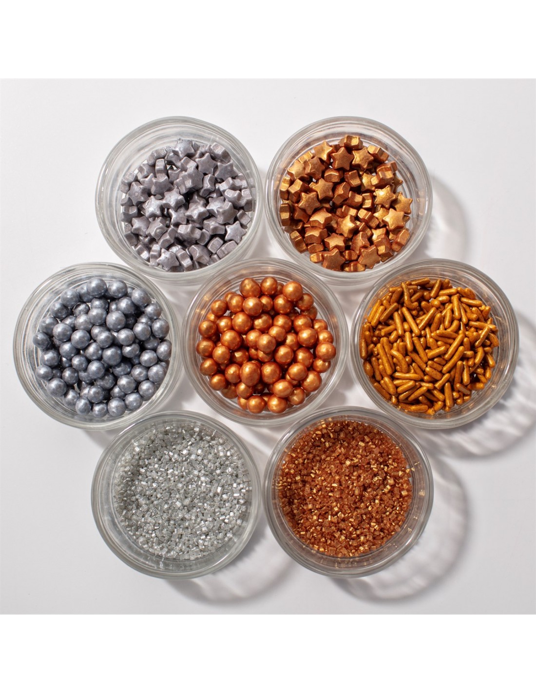 7 bolsitas de sprinkles comestible en azúcar de colores oro y plata.