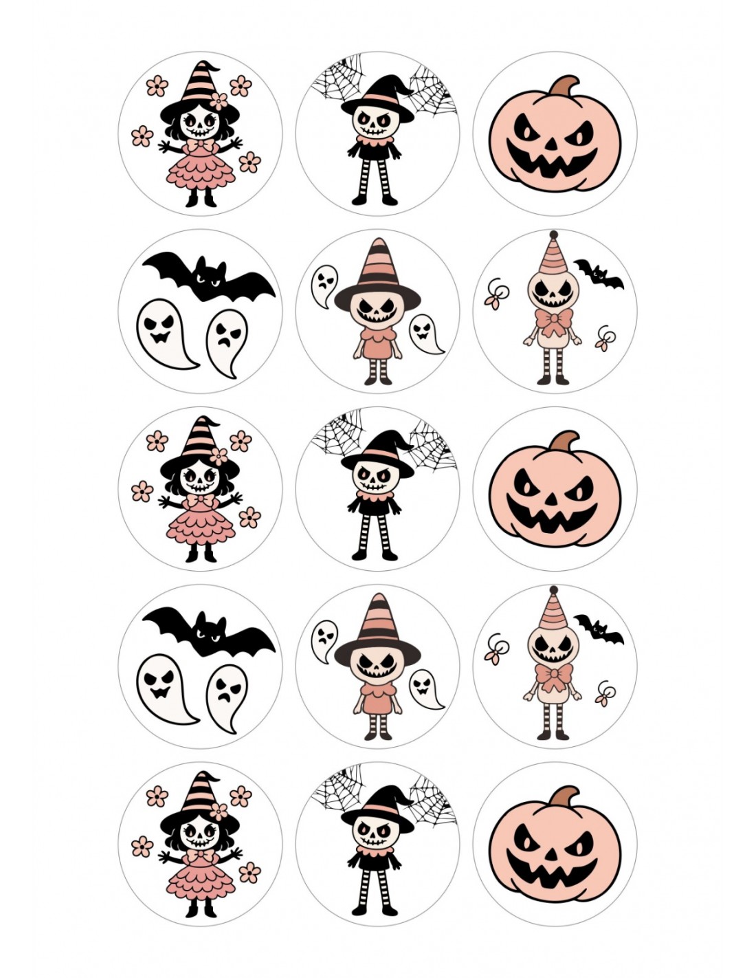 Cada hoja incluye 15 círculos comestibles de 5 cm de diámetro, impresos con tintas alimentarias de alta calidad, sin gluten y totalmente seguras. Encontrarás pequeñas brujitas con sombrero, calabazas sonrientes, murciélagos juguetones y fantasmas amigables que llenarán tus dulces de encanto.