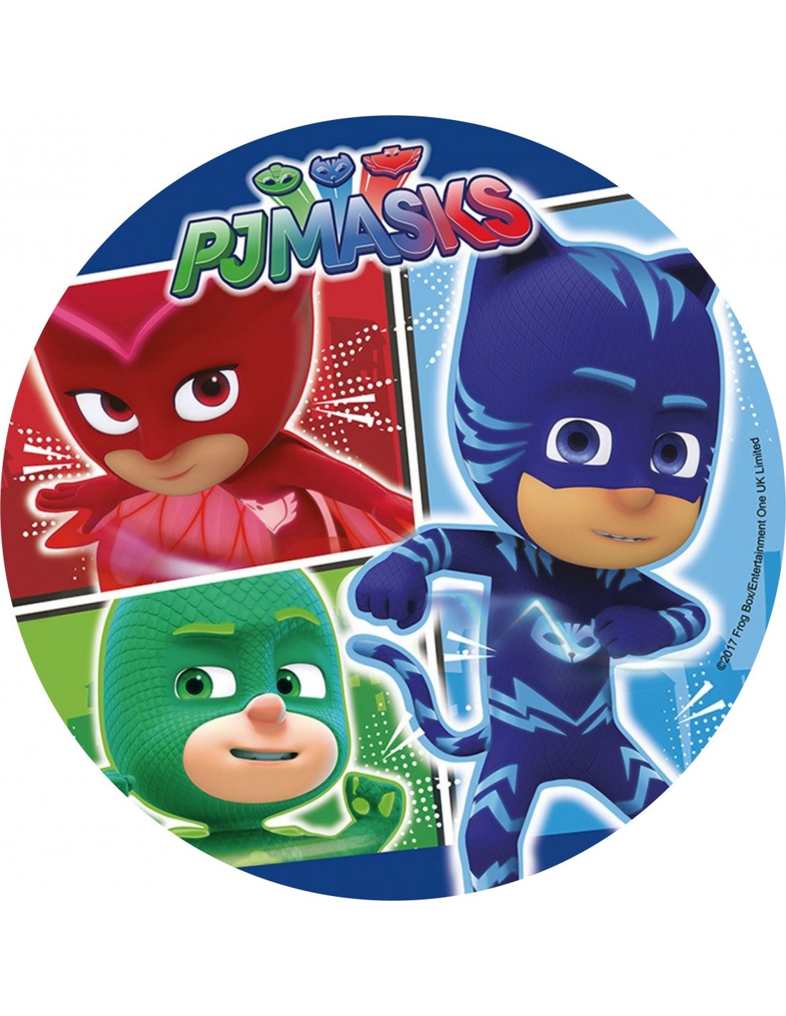 Hoja de papel de azúcar impresa con tinta comestible para decorar tartas de temática PJ Masks.